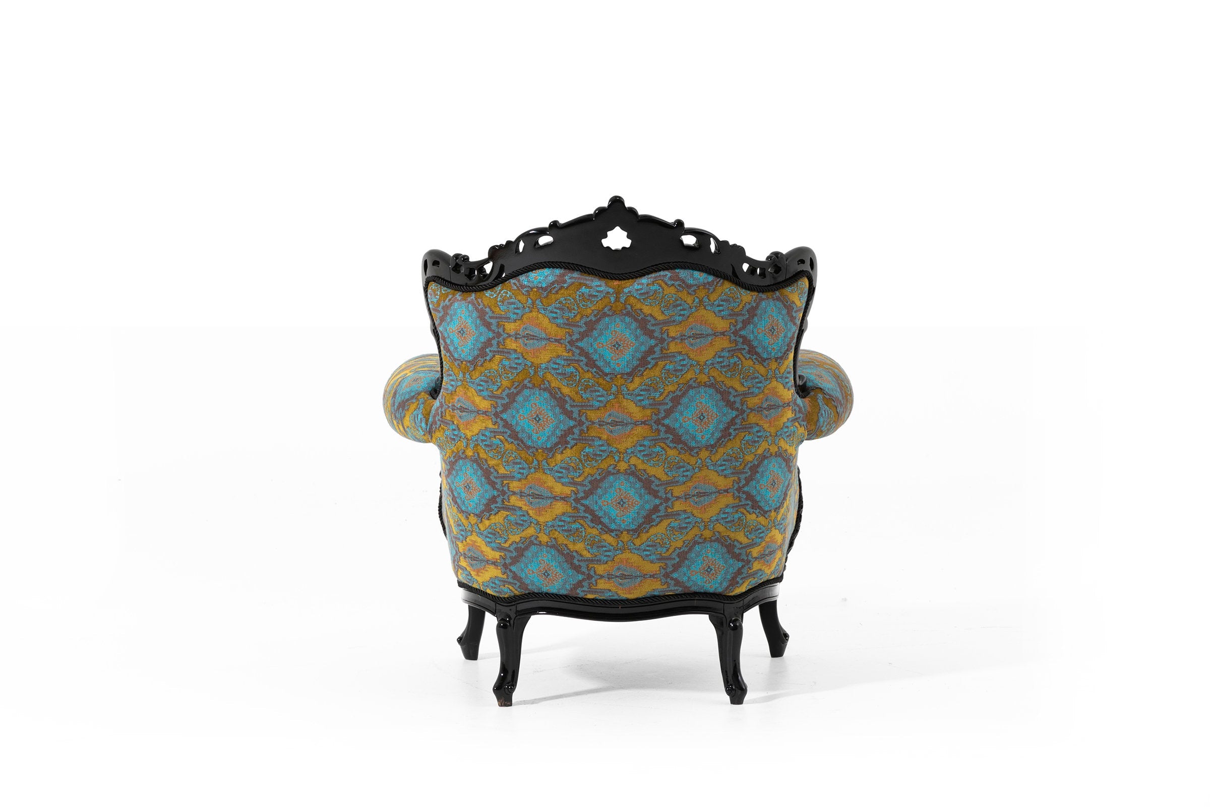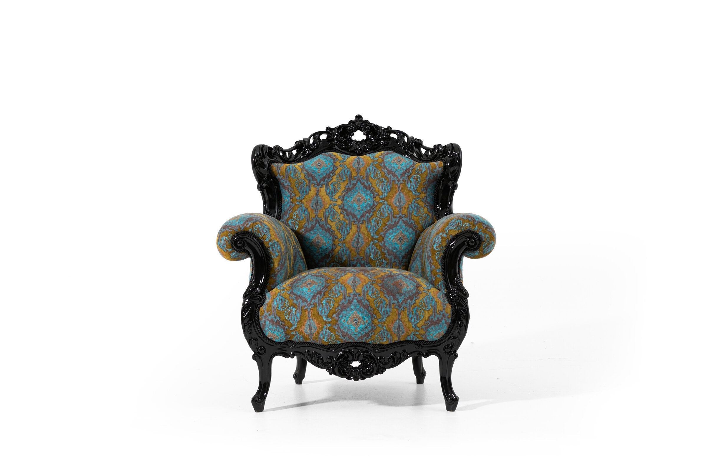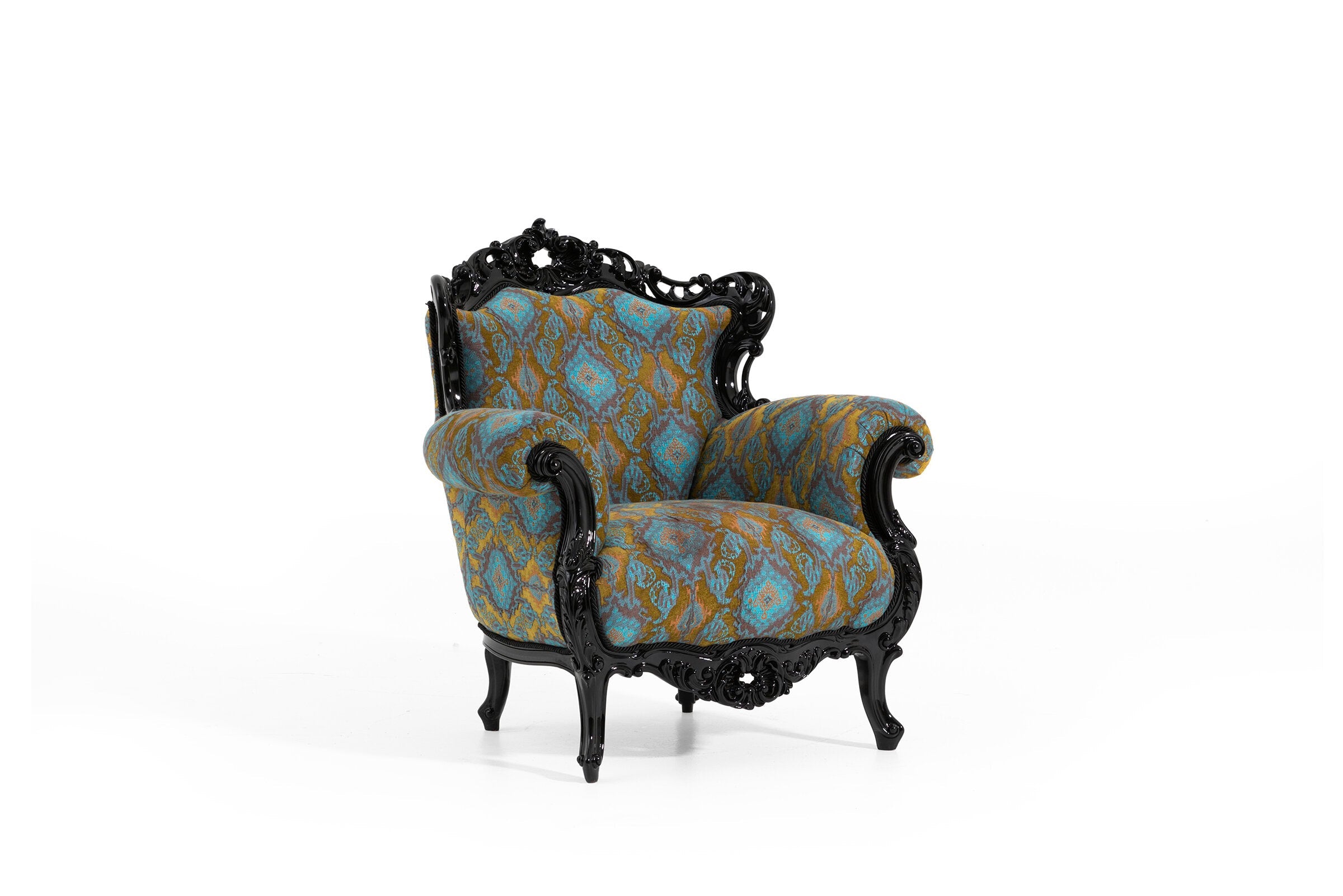 The frame of the armchair is made of polyurethane casting and natural wood materials that prioritise durability and robustness. This combination provides a long-lasting use as well as a timeless look. The specially designed fabric with soft texture and elegant patterns adds a characteristic elegance to Picasso armchair and attracts attention in any environment. This armchair, which will find a place in the centre of your home, is a perfect combination of comfort and elegance.